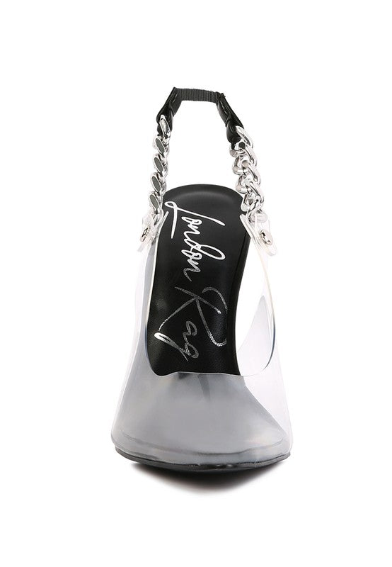 High Heeled Clear Sandals which are trendy styles showing all skin and keeping bare minimum color on the feet. It has elasticated slingback with metal chain detail which hold to the feet well.
