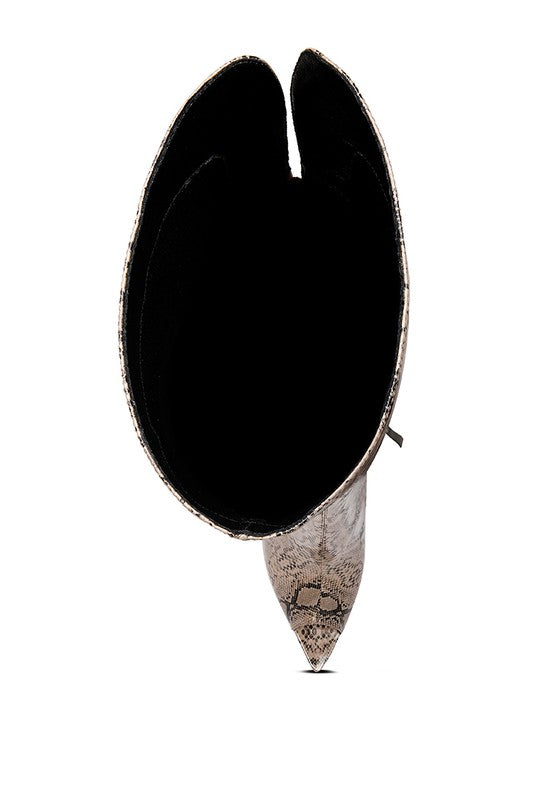 Wearing these stunning long heel boots with a snake print will make you stand out from the crowd. The all-over pattern is striking and distinctive, the heels will boost your confidence and the side zipper opening makes it easy to wear.