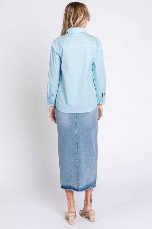 regular size, standard, young contemporary, contemporary, rhinestone, embellished, poplin, solid color, woven, shirt, blouse, top, button-up, collar neck, long sleeve, fancy, glam, glamourous, trendy, stylish, fashionable, classy, casual, daily wear, everyday wear, night out, party outfit, all season, transitional, spring, summer, fall, winter, ss, fw, women's clothing, women's apparel, women's wear