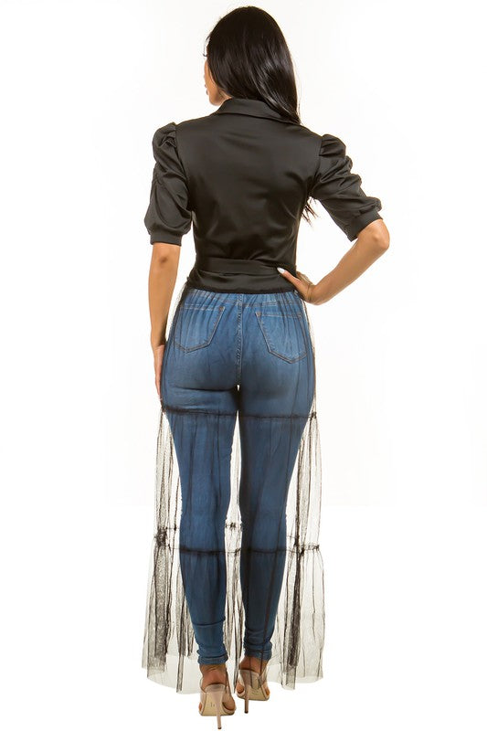 Sexy fashion top shirt, short sleeves, front button with mesh skirt design